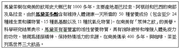 在世界上享有"南美仙草"和"天賜神茶"美譽,和足球、探戈、烤肉並列阿根廷四絕國寶的"馬黛茶"就是所有以上問題的答案。馬黛茶除了其獨特而神秘的南美異域文化之外,在今天看來對人類現代生活更具有深遠的影響,因為其廣泛及神奇的健康價值:經「阿根廷布宜諾斯艾利斯醫學院」、「法國巴斯德研究院」、「美國哈佛大學醫學院」、「日本城西大學醫藥學部」等世界知名專業機構的研究结果表明:馬黛茶可廣泛影響神經、血液、消化、泌尿、免疫、内分泌及抗氧化系统,能改善呼吸、清除膽固醇、改善血液循環、抗氧化、抗過敏、預防單纯性肥胖、高血脂症、憂鬱症、糖尿病、壞血病、缺鐵性貧血等多种用途。