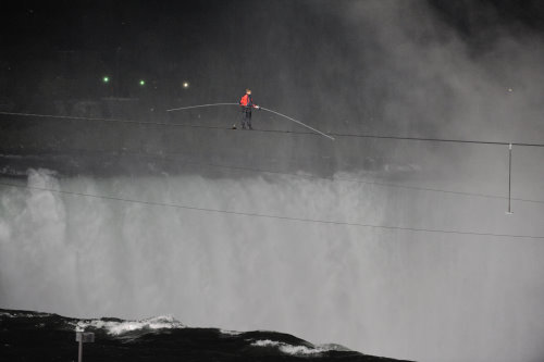 踏上距離水面60公尺的鋼索,手拉著長9公尺、18公斤重的平衡桿,僅花了25分鐘就走完長約550公尺、粗5公分的鋼索,成為百年來以走鋼索方式穿越尼加拉瓜大瀑布的第一人。