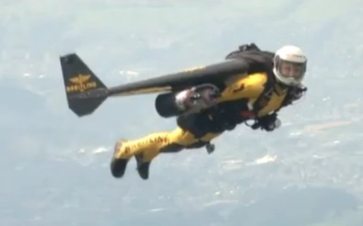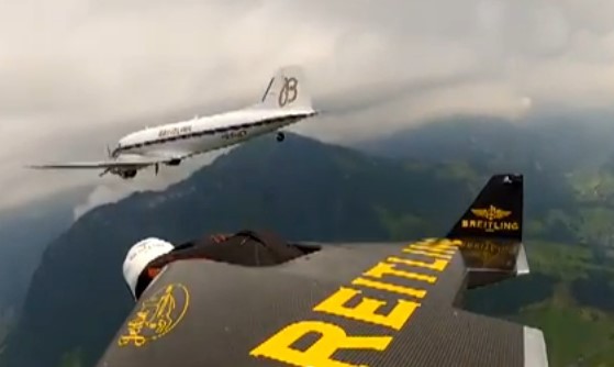 被外界稱為「噴射人」、「火箭人」的瑞士冒險家羅希(Yves Rossy)22日再創壯舉,背上噴射背包,和一架雙引擎螺旋槳客機在空中一同翱翔,整個過程都被拍攝下來並上傳網路。