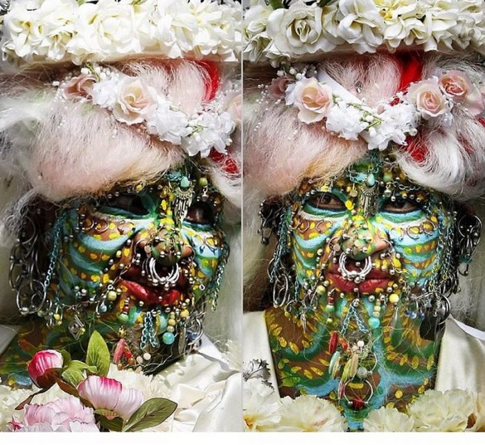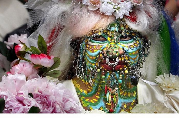 林子大了,什麼鳥都有,世界大了,什麼人都有!當地時間6月8日,世界上身體穿孔最多的女人伊萊恩·大衛森(Elaine Davidson)在英國愛丁堡出嫁,全身上下6925個穿孔戴滿了首飾,而她的丈夫則完全沒有穿孔。