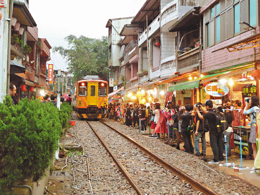 平溪鐵道十分站的「火車門前過」奇景,讓聯合國世遺組織的日本學者西村幸夫非常驚豔。(圖/新北觀旅局提供)