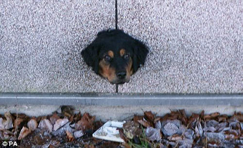 動物天生就愛找狹窄的地方鑽,臉往前鑽得進去,但有時往後就退不出來,遇到這種狀況~好像用些許的油或肥皂水潤滑慢慢來才是正解,特別是野生動物,人類圍在旁邊大呼小叫還出動電鋸會把牠們嚇死吧> <