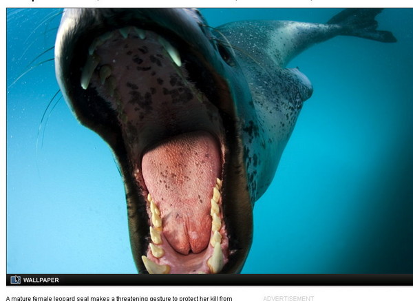 尼克倫表示,當時為了拍攝巨大的豹斑海豹,他冒險靠近這頭進食中的掠食者;但海豹立刻察覺到了,還丟下企鵝獵物朝尼克倫撲了過去。尼克倫表示,海豹的頭比熊還寬2倍,「牠張開大嘴將我的腦袋連同照相機一併吞了進去。」