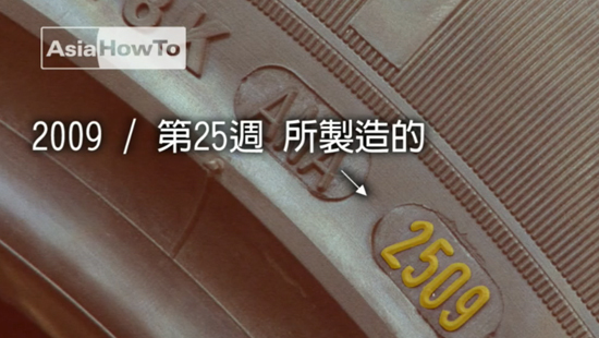 輪胎的製造日期,以一組四位數字來表示,前兩碼代表週期,後兩碼代表西元年,所以輪胎上標示「2509」之數字,意即於2009年第25週製造了這個輪胎。