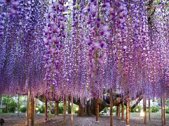 初春的櫻花之後,就是紫藤的季節。每年4到5月,日本九州市河內富士花園會出現一項壯麗奇觀──面積100坪大的藤架,纏繞於其上的是22種,150株紫藤花的盛開,看到的人無不驚艷其絢麗斑斕的景象。