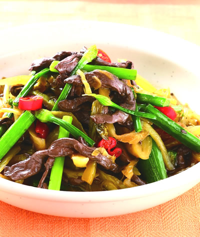 4.取鍋,加入少許油燒熱,放入蒜片和辣椒絲炒香,加入作法2的鴨血、作法1的酸菜絲和調味料以大火拌炒均勻即可。 <div style="display:none;"><a href="https://seninlinkin.com">Ziyaret Et</a></div>