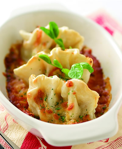 1.茄汁肉醬平鋪於焗烤容器中,整齊排入燙熟的水餃,撒上起司絲。