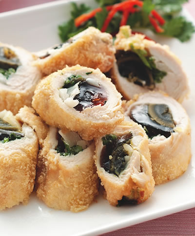 4.熱油鍋至油溫約120℃,放入作法3的雞肉捲以小火炸約8分鐘,撈起瀝乾油脂後切段盛盤即可。