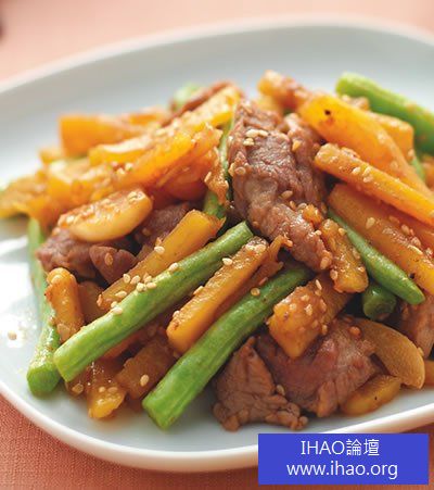 1.梅花豬肉切成1cm的條狀;地瓜去皮、切1cm條狀;四季豆去粗絲、切段,備用。