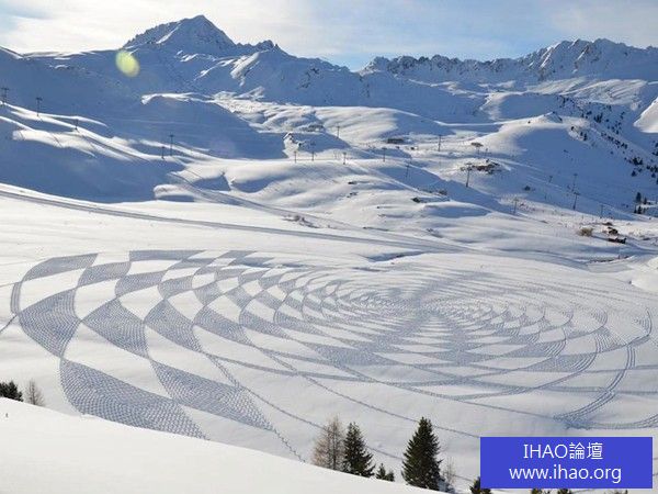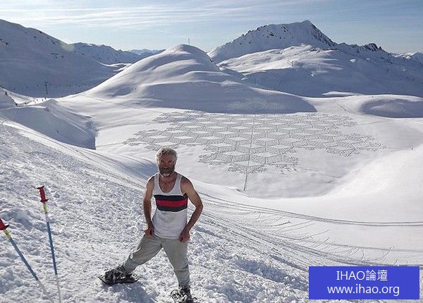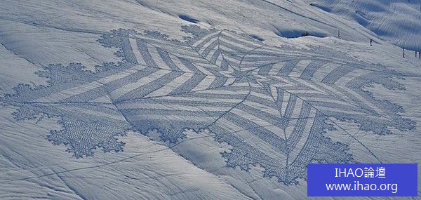 其實這是藝術家 Simon Beck 所製作的奇妙雪花圈,他穿著雪地鞋花了幾天的時間,慢慢的用走路的方式創造出這些模樣漂亮的冰雪圖案,每天都要走上5-9個小時,每個雪花圈都約莫三個足球場那麼大。