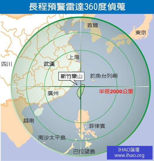 立法院國防立委日前首度前往海拔2680公尺的新竹樂山之巔,檢視成軍運作的長程預警雷達。率隊的立委林郁方透露,雷達偵蒐角度幾乎涵蓋360度,範圍達2000公里以上。推論雷達不但能深入大陸內陸,連東海釣魚台列嶼、南沙太平島,應都在偵蒐範圍內。