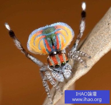這種奇特的「孔雀蜘蛛」屬於跳蛛科,體型非常小,大約只有0.4到1公分左右,不容易引起注意,但只要用攝影鏡頭接近看,就能發現不少「孔雀蜘蛛」身上有超鮮艷的各種色彩,組成幾乎左右對稱的圖案,這些就是雄珠賴以繁衍的最大秘密武器。