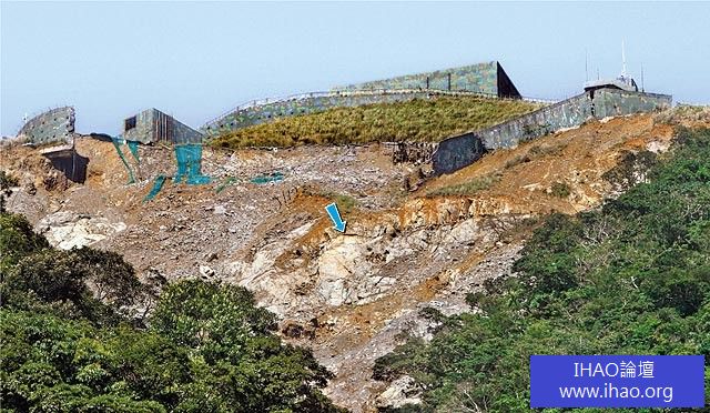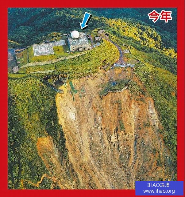 二○一一年東澳嶺雷達站(箭頭處)周邊已有明顯的土石坍方(圖四),虛線框內仍未崩坍,但《蘋果》前天透過空拍,發現該區域已坍塌