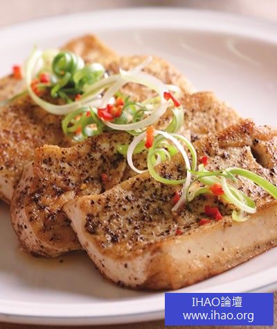 1.板豆腐切厚片抹上鹽;蔥切絲;辣椒切末,備用。