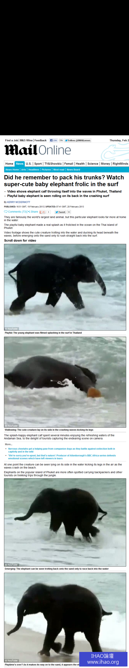 不久前普吉島熱門觀光景點班陶海灘(Bang Tao Beach)上,也有隻熱愛海洋的小象出現,牠的名字叫幸運(Lucky),海灘就像是其第二生命,看到大海便「失心瘋」,還衝動地將象鼻插進海灘中,呈現出「倒頭栽」姿勢,萌樣惹人喜愛,在網路上受到熱烈討論。