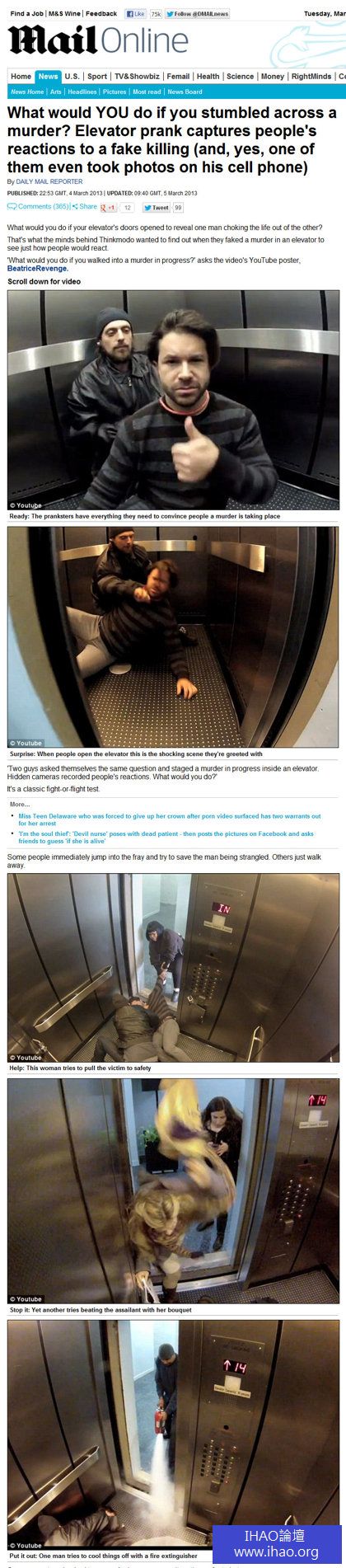 如果打開電梯,剛好看到一個正在進行中的謀殺現場,你會尖叫、逃跑,還是見義勇為,上前救人呢?紐約2名男子決定做個實驗,假裝在電梯裡殺人,然後拍下路人的反應,有人第一個反應就是快速離開現場,有人拿起身邊的東西當武器,要想辦法救人,還有人居然不先報警,拿起手機開始錄影。