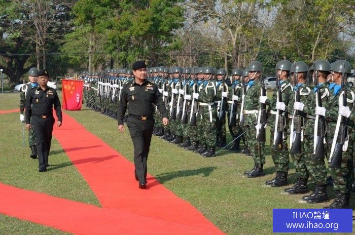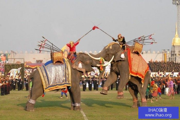 在泰國象兵是一個古老的兵種,泰國每年都要舉行象節遊行,紀念象戰。本圖為在泰國軍隊的一次集會中,兩名泰國復古大象兵正在使用紅纓槍拚殺。由於,屬於表演性質,兩名復古象兵及座騎大象並沒有身著重盔甲。