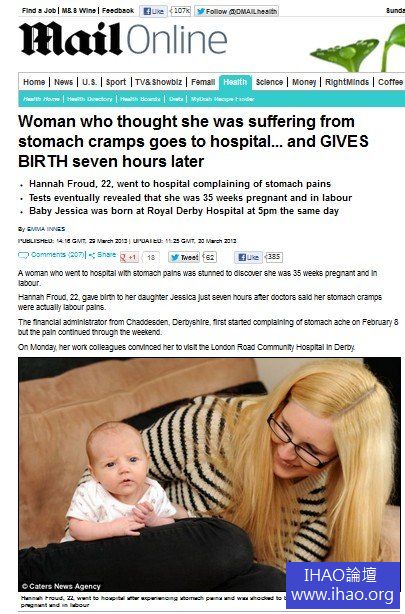22歲的佛勞德(Hannah Froud)本月22日首次感覺到腹部疼痛,當時她不以為意,直到隔個周末仍未改善,25日早上10時才在同事堅持下前往德比(Derby)一間醫院就診。她表示,「起初要做懷孕檢測時,醫師只說是例行性檢查。結果確定是懷孕時,我嚇得說不出話來。」