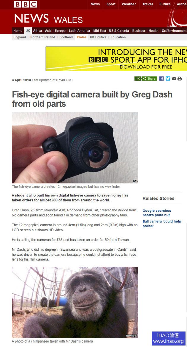 英國威爾斯1名學生為了省荷包,利用舊相機零件製作出魚眼數位相機,意外獲得攝影同好青睞,接到全球近300張訂單,甚至有來自台灣的訂單。