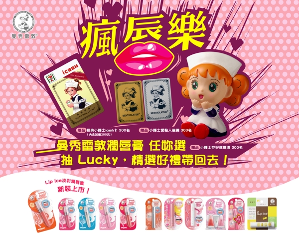 為了歡慶曼秀雷敦120週年生日快樂,特別邀請美唇水水們參加「曼秀雷敦潤唇系列 瘋唇樂抽獎活動」,有機會獲得限量夢幻大獎:小護士存好運撲滿300名、經典小護士i cash卡300名 (內含加值200元),或小護士愛黏人磁鐵300名等。