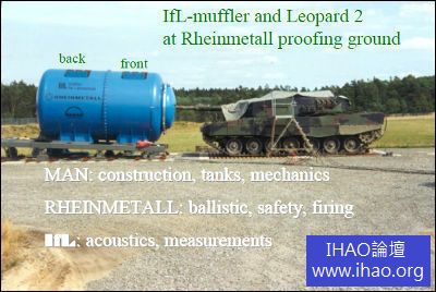 萊茵金屬工廠、IfL中心、與MAN_SE車廠共同開發的巨型滅音器原型機(pdf檔),以豹2式戰車(Leopard_2)的主砲做為測試數據藍本。