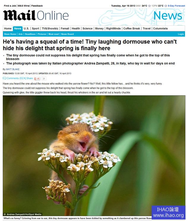 國外有一隻榛睡鼠感受到天氣的變化,知道冬季已經結束,獨自爬到蓍草花上,彷彿是為了迎接春天的到來,將眼睛瞇成一條線,張大了嘴巴,露齒而笑,還發出叫聲,愉悅的心情全寫在臉上。