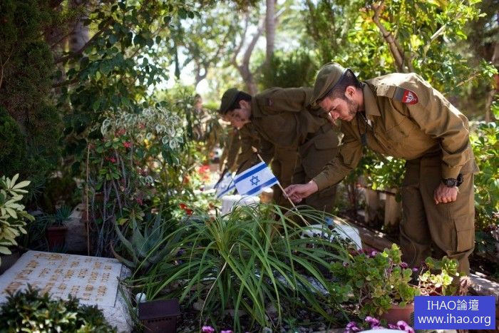 4月14日,以色列特拉維夫,吉瓦掃羅軍人公墓,一名以色列士兵在陣亡將士墓上插上國旗。4月15日是以色列陣亡將士紀念日,隨後將是以色列獨立65週年紀念日。