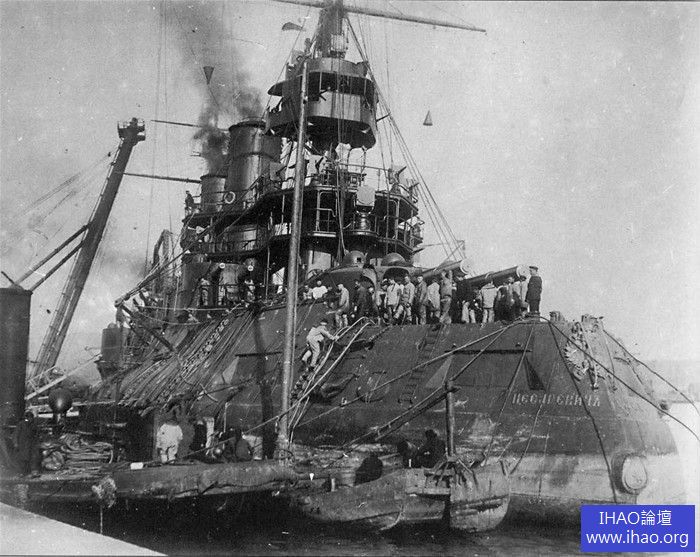 第一太平洋艦隊的列特維贊號戰列艦,美國造,日俄戰爭中俄羅斯綜合性能最好的戰艦,這是俄國人第一次在外國建造的戰艦。此時已被日軍岸炮擊中坐沉。