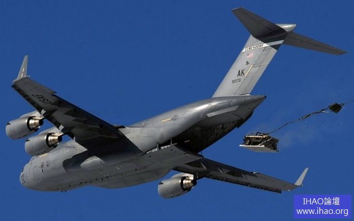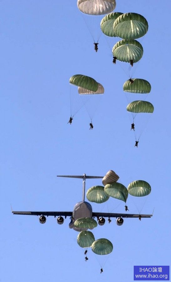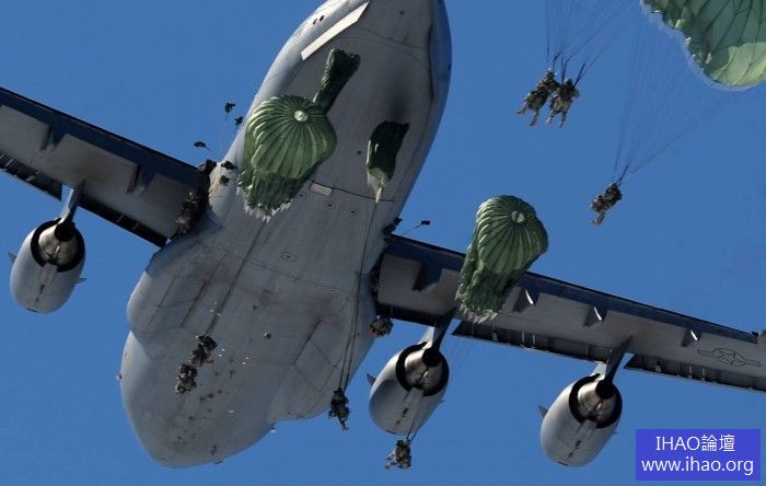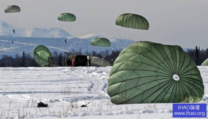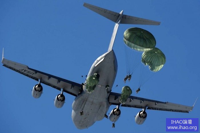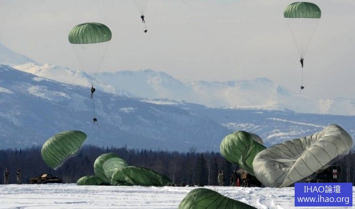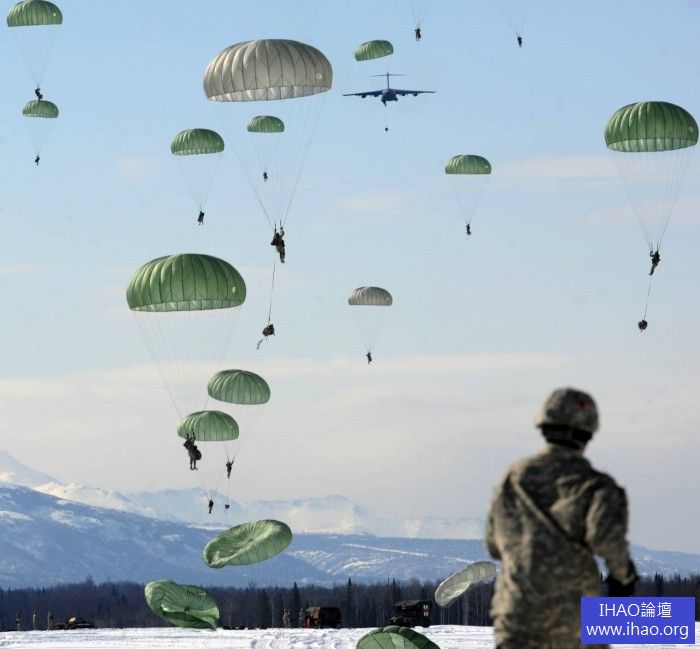 美國陸軍阿拉斯加第425旅特種兵大隊的士兵空投悍馬,隨後約60名傘兵從一架C-17飛機躍出,2013年4月17日