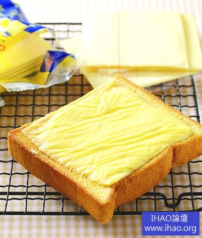 1.先將厚土司放入烤箱中以180℃烤至表面呈現脆黃狀,再取出塗上奶油、撒少許鹽、放上芝士片。