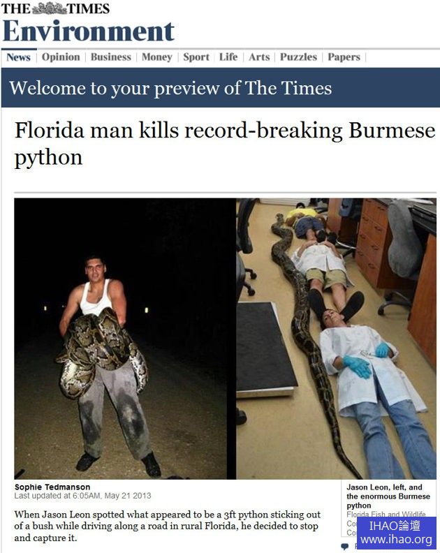 佛羅里達抓到一條將近六公尺長的大蟒蛇,去年八月,佛羅里達的沼澤國家公園,