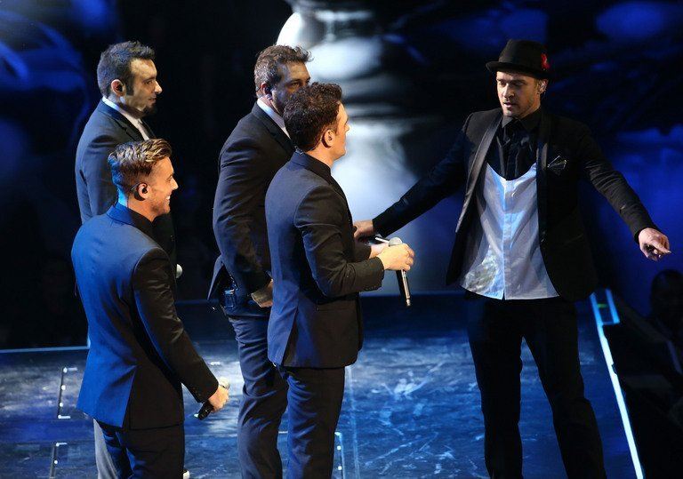 今天賈斯汀也卯足全力,獻唱「性感反擊」(Sexyback)等賣座金曲,之後還與曾經組團的男孩團體「超級男孩」(NSync)上演大合體,並賣力演出當時代表作「女朋友」(Girlfriend)以及「再見我的愛」(Bye Bye Bye)。