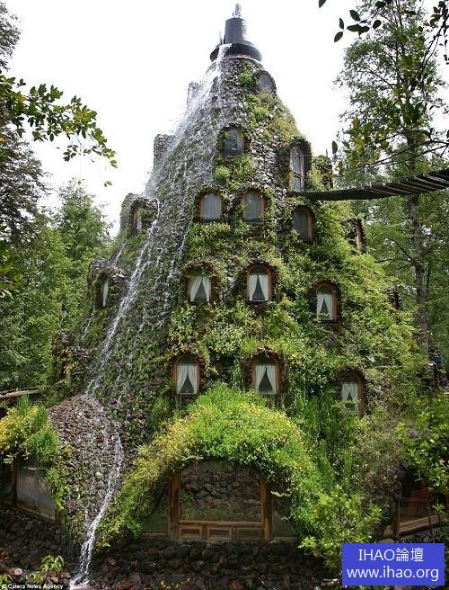 智利原始森林中有一家奇特的賓館,它形似火山,噴泉從建築頂部汩汩而下