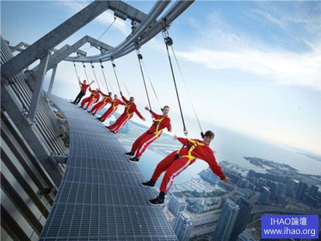 癡迷於高度體驗?據人民網報導,那加拿大國家電視塔——西半球最高的獨立建築,絕對是你不容錯過的地方。而在2011年8月推出的『邊緣行走』體驗,允許尋求刺激者懸掛在環繞電視塔頂部5英尺高的架子邊緣,俯瞰1168英尺下多倫多喧鬧的街道。這個360度鍍鋅鋼結構建築有36支突出的鋼臂供膽大的游人體驗懸於高空的感覺,絕對驚心動魄。