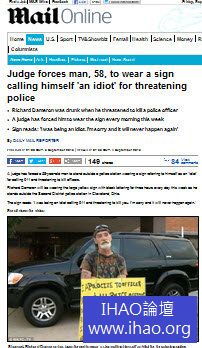 美國俄亥俄州(Ohio)一名58歲的達梅倫(Richard Dameron),因喝醉酒打電話到911,並宣稱要殺死一名已退休的警察,隨即遭到警方逮捕,法院則判達梅倫需在身上掛著標語,站在街頭道歉,並承認自己是「白癡」(idiot),不會再犯。
