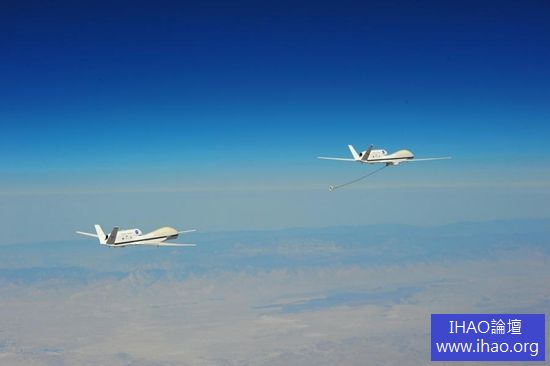 美空軍已於2012 年用2 架“全球鷹”無人機完成了無人機空中加油試驗,標誌著無人機在編隊飛行技術方面取得了歷史性的突破。圖為“全球鷹”無人機模擬空中加油編隊