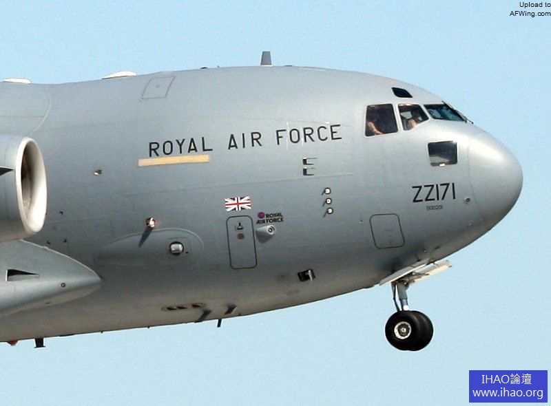 英國空軍C-17運輸機艙門後方是大型飛機紅外反制系統跟踪傳感器及激光干擾器機座,艙門正前方是導彈逼近警告器