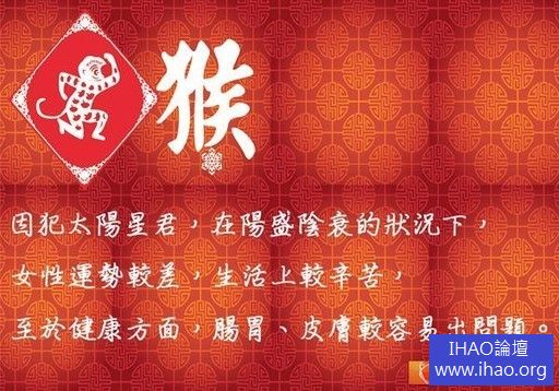 由於犯太陽星君的關係,在陽盛陰衰的狀況下,今年屬猴的女性運勢較差,生活上較為辛苦。至於健康方面,則容易在腸胃、皮膚上出現問題。