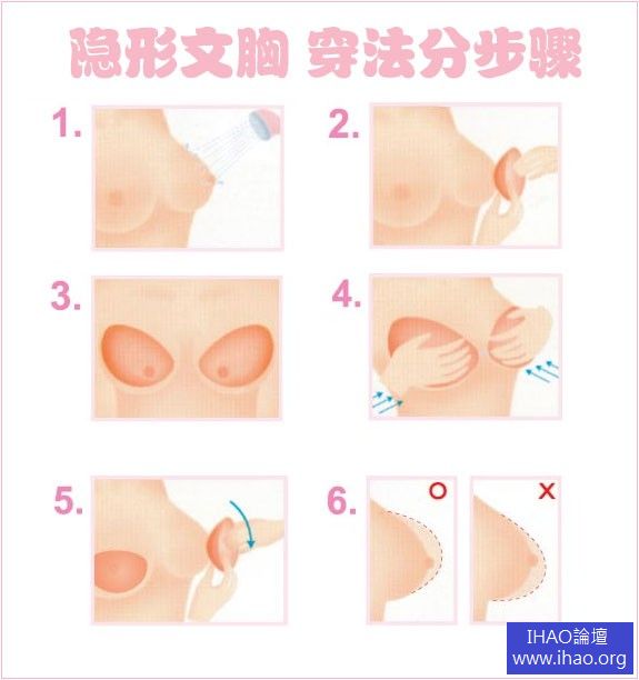 第二步:貼的時候從外側的下方開始貼,然後把腋下的肉肉擠到中間當乳 溝,nu bra貼上時胸部下方要空出1公分左右,貼的時候身體要先45度彎腰貼1/3,上提再貼3/1,站直時再貼1/3,三步按順序進行。