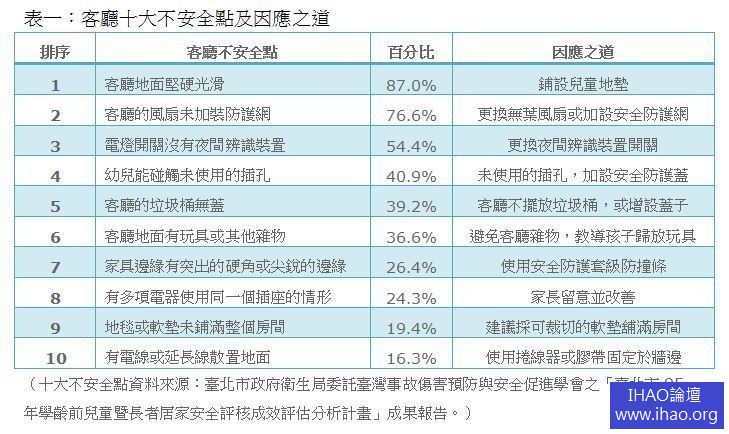 為避免像小文這樣的案例層出不窮,身為家長不能不輕忽居家安全重要性。台北市衛生局資料顯示,居家環境最大的威脅在客廳以及浴廁(如下表),如何改善這些不安全點,是身為父母親的重要使命。