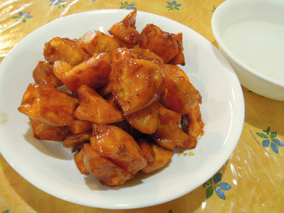 1地瓜切塊先起油鍋 .把切塊的地瓜放下去炸熟慢慢翻炸. 邊用筷子戳入地瓜 .看裏面是否鬆鬆的火不能太大. 怕會外面焦掉裏面卻還是硬的
