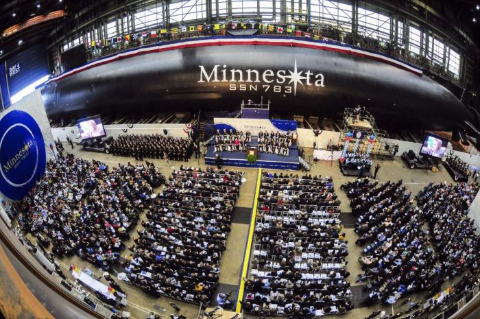 美國海軍網10月27日消息:維吉尼亞州的紐波特紐斯新港造船廠內,美國海軍與船廠聯合舉行第10艘「維吉尼亞」級攻擊潛艇「明尼蘇達」(SSN783)號新艇建成儀式。