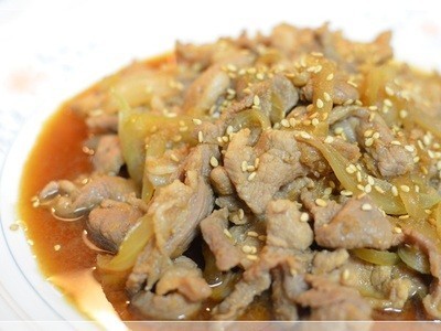 2熱油鍋炒洋蔥。待洋蔥成半透明狀且香氣溢出,加入醃好的肉片拌炒至豬肉變色。加入4大匙調味料續炒至入味。起鍋後灑上白芝麻即完成