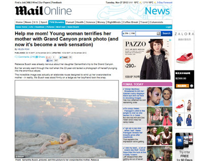 美國伊利諾斯州一名22歲女子薩曼莎‧布斯(Samantha Busch)日前和男友到大峽谷露營時,突發奇想請男友替她拍一張假裝掉落懸崖照,將照片傳給媽媽,又關閉手機的GPS定位系統,人間蒸發1個禮拜,讓母親整顆心懸在半空中。