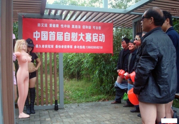 「自慰大賽」週三在深圳梧桐山藝術小鎮拉開序幕,10名男女借助充氣娃娃、肉靈芝、飛機手電筒、情趣制服等成人用品,進行雷人的自慰表演。不過可能是旁邊有攝影機,這「七條好漢」都戴著面具,透過影片觀看,更讓人忍不住想笑。