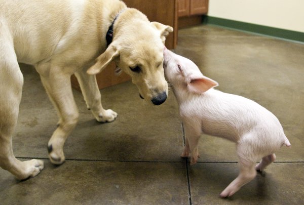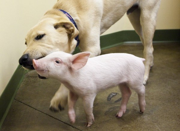 美國堪薩斯州一隻小豬被獸醫拯救後,很快跟一隻拉布拉多犬成為好朋友。當時小豬才4磅(1.8公斤),長成大豬後體重直增到300磅(約136公斤),不過「身高不是距離,體重不是問題!」這兩隻相差100多公斤的動物還是好朋友。