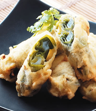 4.將作法2的蔥卷均勻的沾裹上作法3的麵糊。
