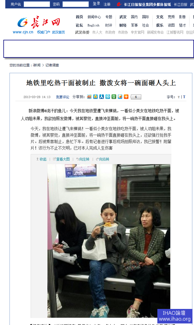 湖北武漢一名女子在地鐵車廂內吃麵,周圍乘客勸阻未果,一名正義女子拿出手機拍照,不料吃麵女竟然將整碗麵倒到她頭上。此事在網上引發熱議,不少人都直斥吃麵女素質差,但也有人認為正義女將照片上傳網路涉及個人肖像權。