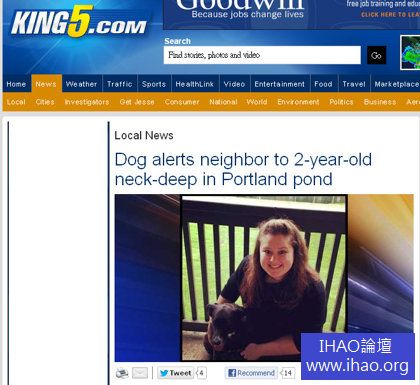 美國波特蘭1名婦人飼養的小狗,昨天在家朝窗外急躁狂吠,婦人查看發現有鄰家男童正走進大池塘,等到婦人緊急趕到,男孩已水深及頸,所幸即時救上岸,未釀成悲劇。