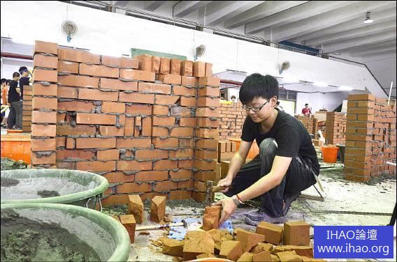 「就是想挑戰自我,看自己的極限在哪裡」,黃郁婷選讀女生很少就讀的建築科,當起「土水師」;比賽中和廿五位男選手一樣搬著近百塊磚頭,攪拌水泥砌磚,儘管全身髒兮兮,她還是發揮女性特質,砌出的磚牆精準度很高。